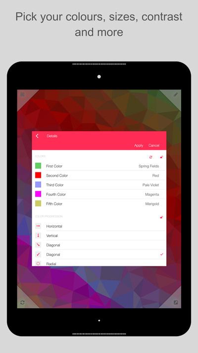 Con Polygen puedes crear "arte abstracto" de la nada o de una imagen seleccionada como la base. Y asi puedes añadir todo tipo de polígonos para crear una imagen única. Puedes configurar los colores, ajustar el contraste y las formas, y añadir polígonos. Las imágenes creadas puedes, compartirlas, y luegp establecerlas como fondos de pantalla en tu telefono o tableta.