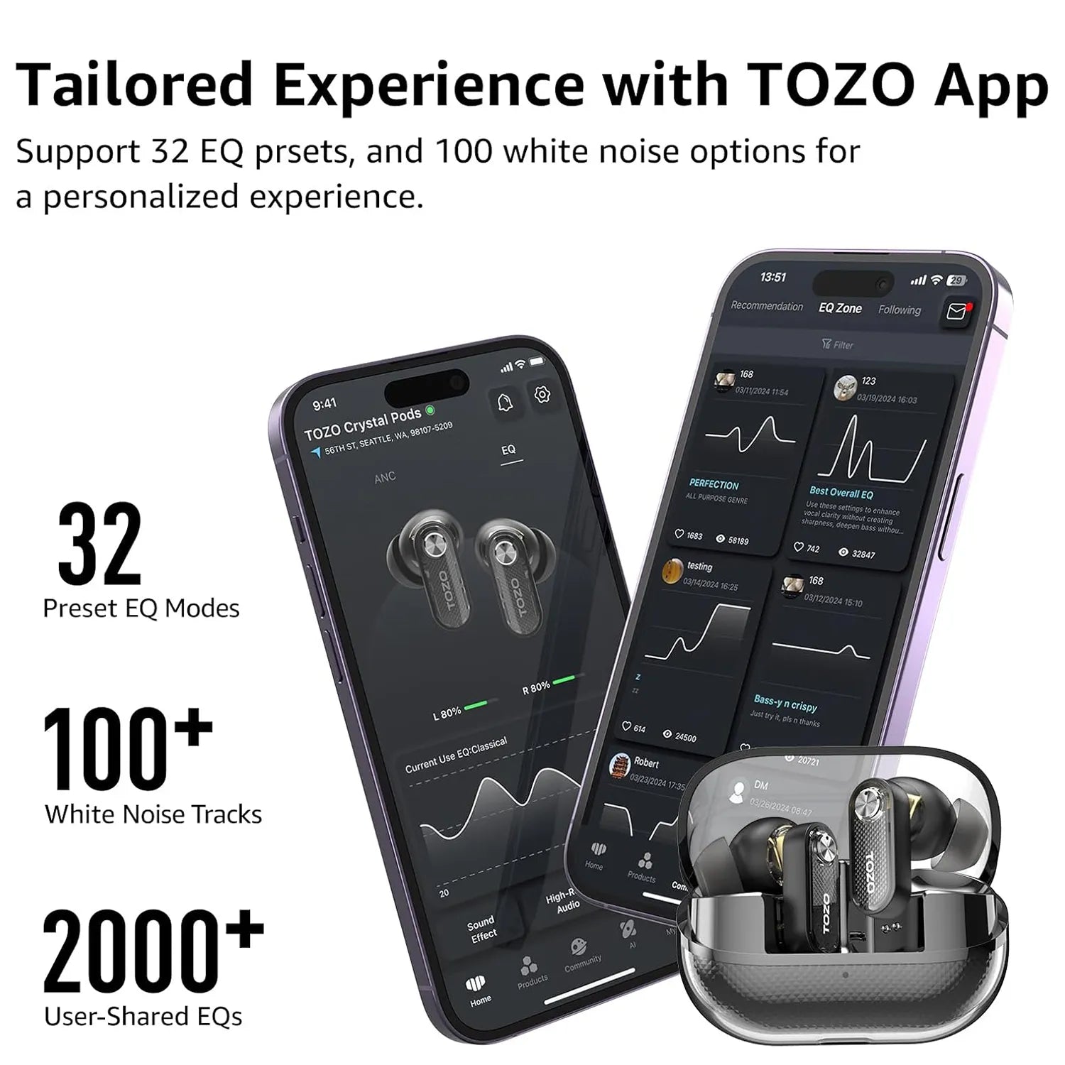 Utiliza la aplicación TOZO para personalizar los controles y elegir entre 32 preajustes de ecualizador. También puedes compartir los ecualizadores personalizados con más de 2.000 audiófilos de todo el mundo en la 'EQ Zone'.